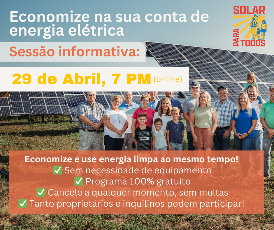 Para participar da sessao inforativa, registre-se aqui: bit.ly/comm-solar-port. Mesmo que você não possa participar ao vivo, registre-se e enviaremos a gravação da reunião diretamente para o seu e-mail.